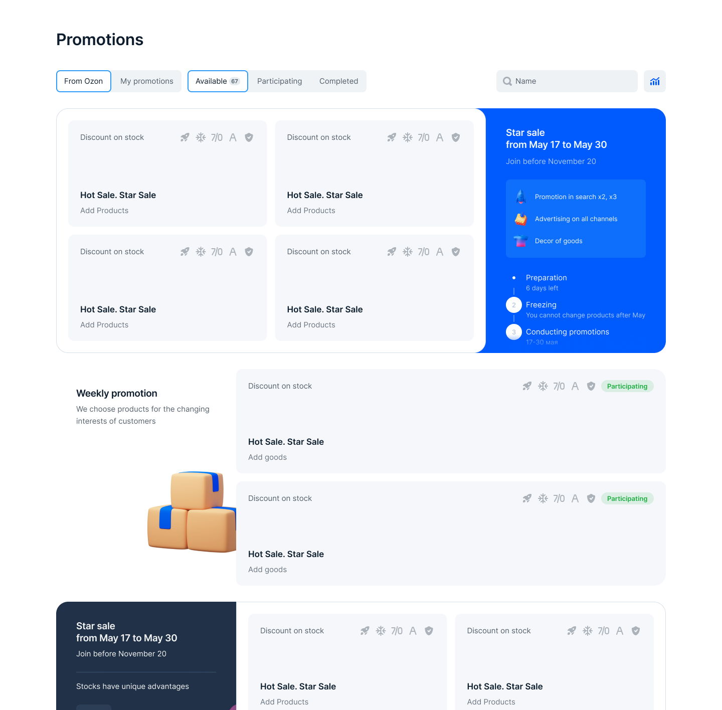 All promotions are grouped by color and by benefits. For example, Electronics sales are highlighted in green in the calendar, in the list and in the promo banner. This is done so that the seller understands exactly how his goods will be advertised.